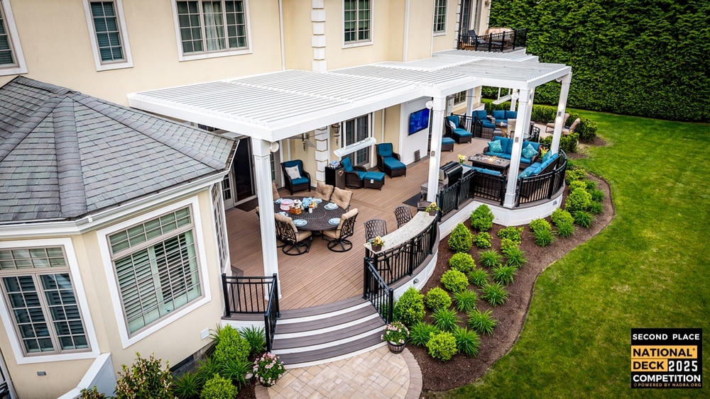 Every detail followed the curve: from the deck’s flowing perimeter to tight-radius fascia and railing lines that soften the home’s angular architecture. The design elevates the back of the house, adding warmth and dimension while maintaining visual harmony.