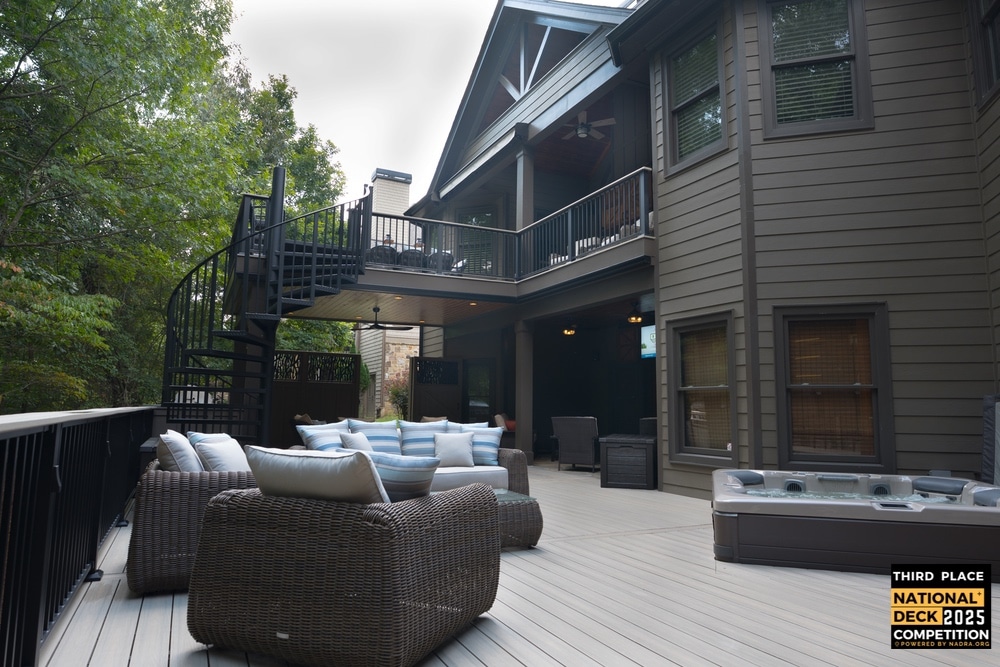 At Random Winds Bluff, this 1,500-square-foot alternative deck was designed to create a multi-functional outdoor retreat that connects every level of the home. The upper deck serves as a dining and entertainment zone complete with a retractable awning, offering shade and comfort while maintaining an open, airy feel. From here, guests can overlook the lower living spaces and enjoy seamless transitions between cooking, lounging, and relaxing.