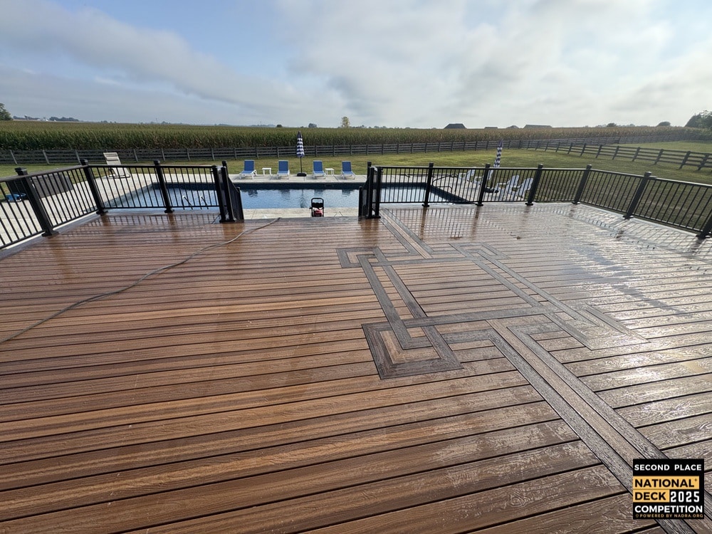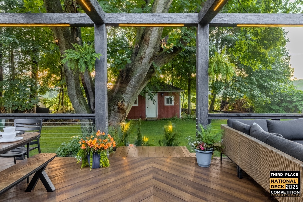 This Farmstead Deck reimagines outdoor living through precise geometry, material harmony, and craftsmanship that honors both heritage and innovation. The centerpiece is a custom chevron-pattern deck with a diamond inlay, perfectly aligned