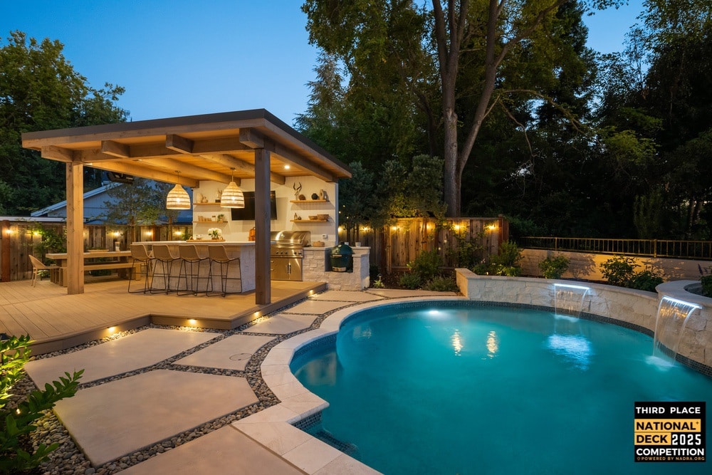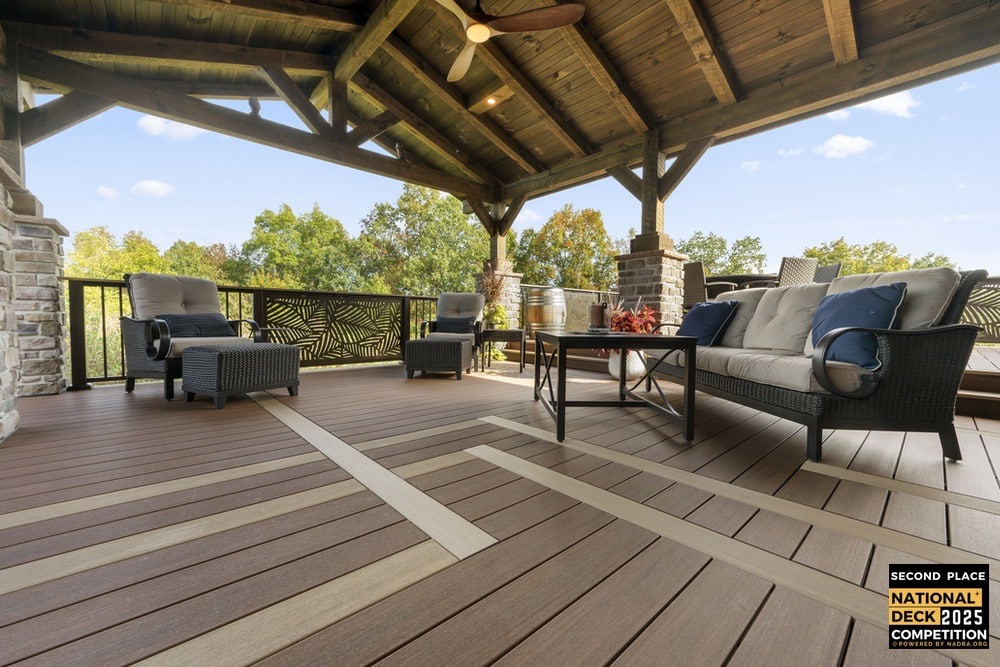 This project truly embodies the “Limitless Creations” category — a perfect blend of artistry, engineering, and craftsmanship. Every element was custom-built to achieve a cohesive, high-end outdoor living experience. The deck features a complex, multi-level layout with intricate board patterns that flow seamlessly throughout, including down the staircases — a signature design element that requires exact precision and vision. Above, the custom roof structure was built from massive rough-sawn timbers that bring a rustic, lodge-like character to the space while maintaining architectural balance with the home.