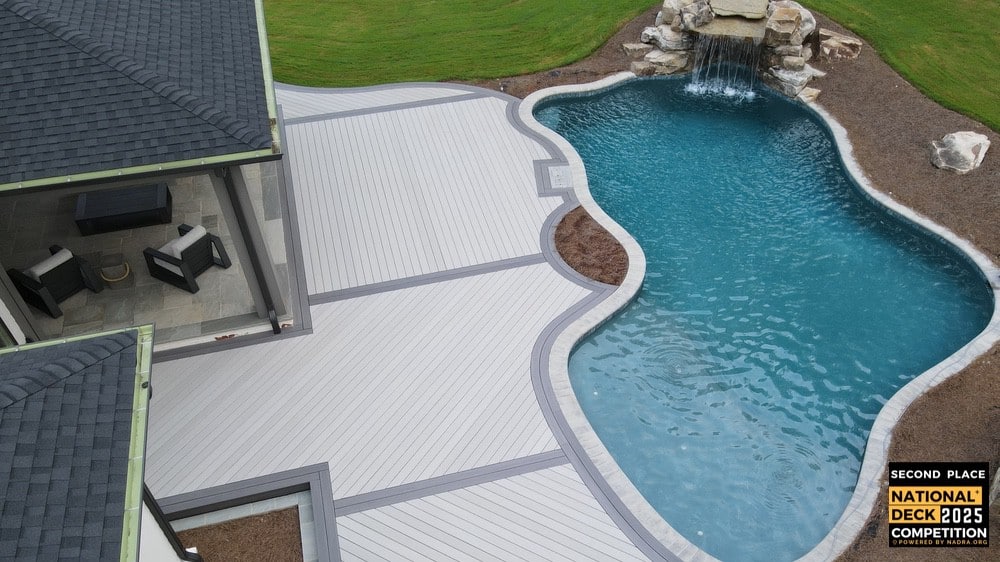 This is a one of a kind deck. Literally. It is the first time anyone has ever attempted what we attempted at this scale! The project is two matching decks and stairs on either side of a new pool. The key feature is that every single board on both decks and stairs are “waterfall” deckboards. Meaning the deckboards run across the deck and then turn 90 degrees to go down the side of the deck. Normally it would be two deckboards mitered at the turns, but ours are all single continuous boards. On the stairs it’s even more dramatic. The boards go up one side, turn 90 degrees and go across the top of the stairs and then turn 90 degrees again to go down the other side. All with single continuous boards. Many builders have done waterfalls with 2-3 boards or maybe a bench. But never two massive decks and full stairs! This was easily the most complicated and difficult deck we have ever built! We also installed custom frameless glass railings on both decks to allow for everyone to see the waterfall features!