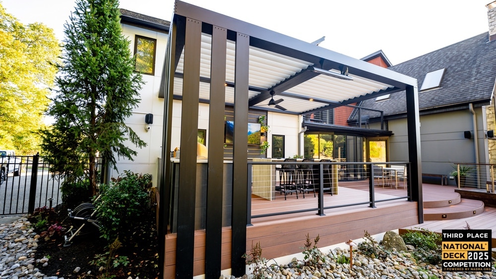 Guided by the home’s modern architecture, the new design introduced a motorized pergola that blends seamlessly with the structure, supported by six slender corner posts that serve as both functional and sculptural elements. Straightening the deck’s corner created a larger, more efficient kitchen layout and space for a generous island with seating.