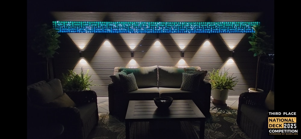 This unique feature had one goal: to make light itself the centerpiece. At the heart of the build is a fiber-optic lighting system powered by a light engine that feeds over 1,000 individual strands of light. Every strand required a precise pre-drilled opening and had to be hand-threaded and punched through the backside of the wall. The wall was flashed and sealed to ensure a dry, protected installation. On the front side, each fiber emerges into a recessed shadow-box cavity. Decorative PVC lattice conceals the structure, while hidden strip lighting illuminates the interior of the shadow boxes. The result is a kinetic display where twinkling fiber optics interact with the flowing gradients of the strip lighting, producing nearly infinite color combinations and motion effects.