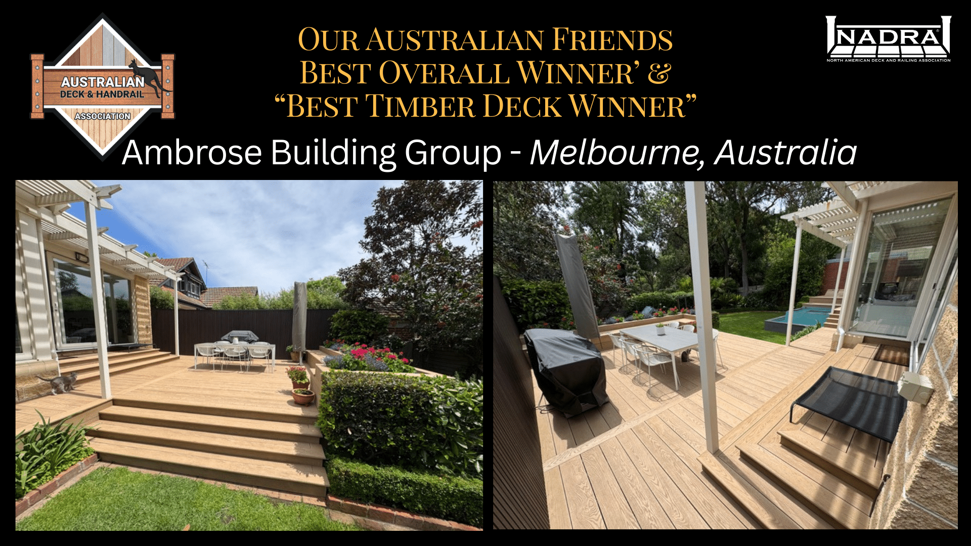 Ambrose Building Group was honored with Overall First Place for Australia. Traveling from Melbourne to attend the Awards Summit, the team joined us in Clearwater Beach to experience NADRA’s awards in person. Their recognition reflects not only the quality of their work, but also the shared standards upheld across the global outdoor living industry in collaboration with the Australian Deck & Handrail Association.