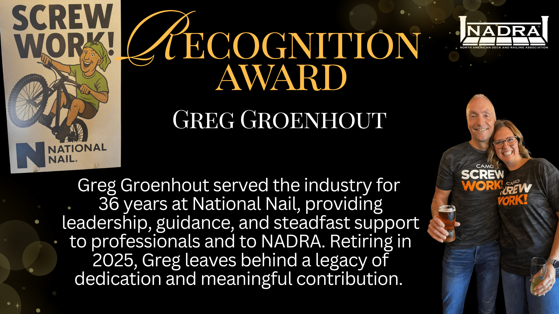 The Recognition Award was presented to Greg Groenhout, honoring 36 years of service to the industry. During his tenure at National Nail, Greg provided leadership, guidance, and steadfast support to professionals across the country and to NADRA. Retiring in 2025, he leaves behind a legacy defined by dedication and meaningful contribution.