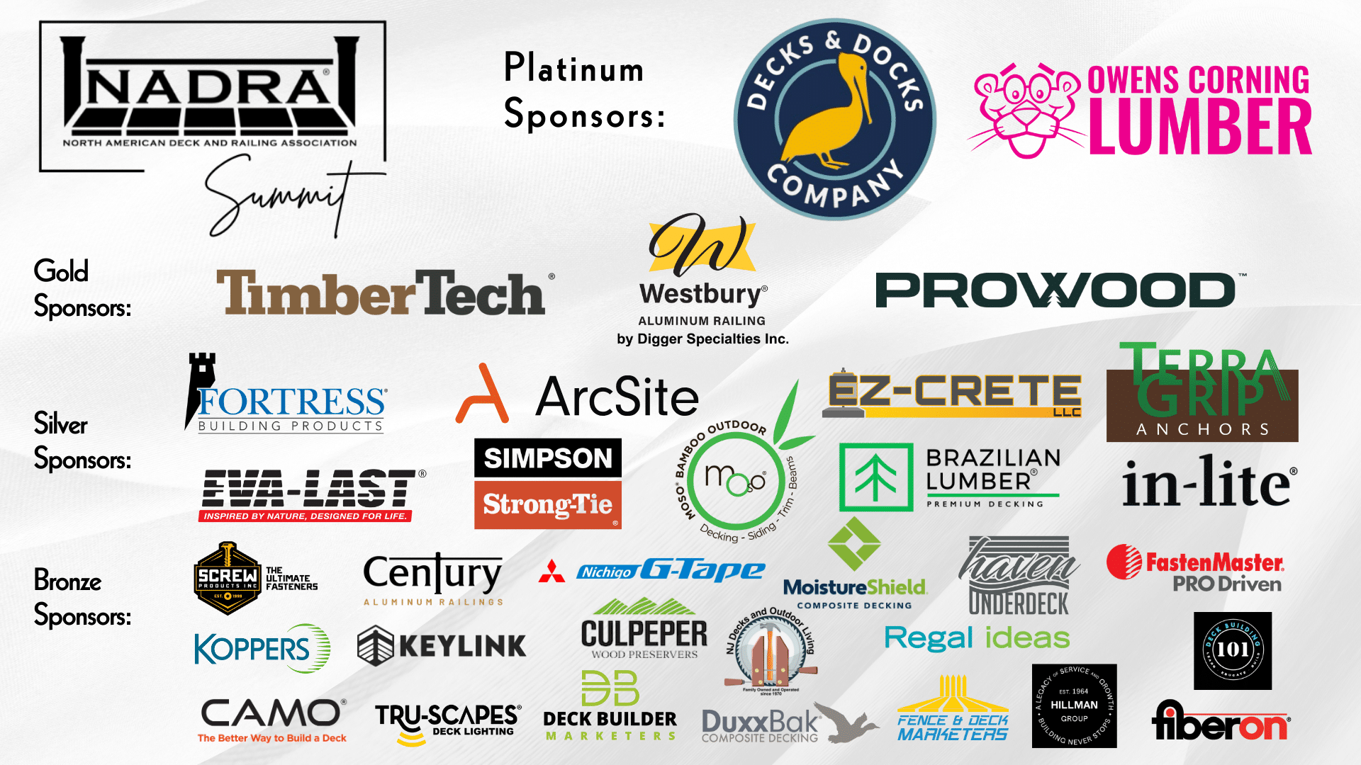 We extend our sincere thanks to our Platinum Sponsors, Decks & Docks Company and Owens Corning Lumber. Their leadership-level support, along with our Gold, Silver, and Bronze Sponsors, played an important role in making the NADRA Summit possible.