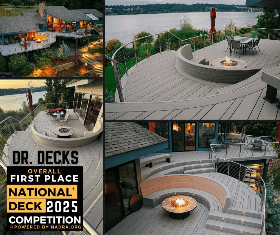 The Overall Winner of the 2025 National+ Deck Competition was awarded to Dr. Decks, recognizing a thoughtfully executed build that demonstrates both technical skill and creative problem-solving. The project reflects decades of experience brought together in a single build, where complex structural conditions, precision detailing, and innovation were central to its success. Highlights include a custom compound curved, tilt-back bench formed through advanced deck board bending techniques, and a striking curved stainless steel top rail with a 12-foot radius. Every detail was intentional, resulting in a one-of-a-kind outdoor space that shows what’s possible when experience and innovation come together.